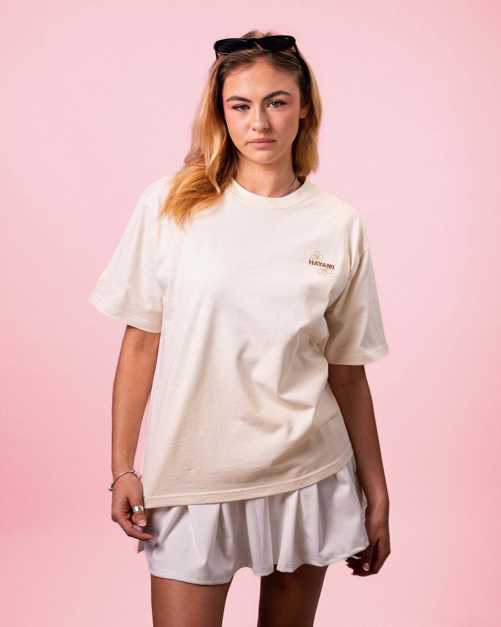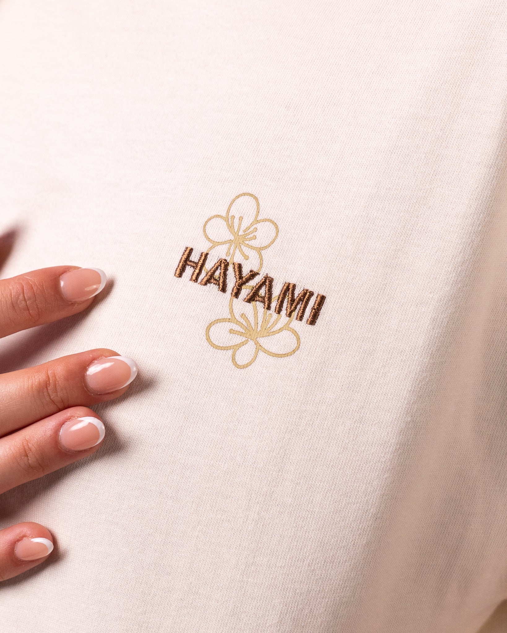 T-shirt 100 % coton à coupe loose pour un confort durable. “Hayami” est imprimé sur la poitrine, avec le logo de la marque brodé sur la manche droite. Dans le dos, les kanji « Hayami » sont sérigraphiés, rehaussés de deux fleurs brodées pour un effet de relief subtil.